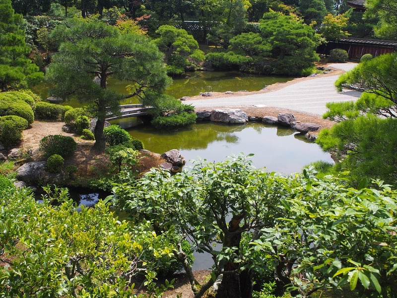 A Japanese Zen garden is known for its minimalist approach and focus on tranquility. It often includes elements like gravel or sand raked to represent water, rocks symbolizing islands, and carefully placed plants. This design promotes relaxation, meditation, and a sense of harmony with nature.